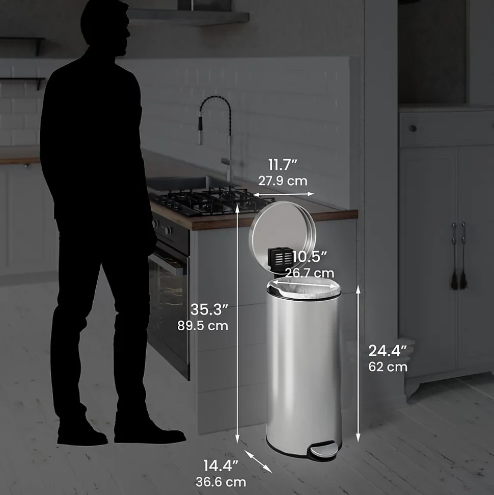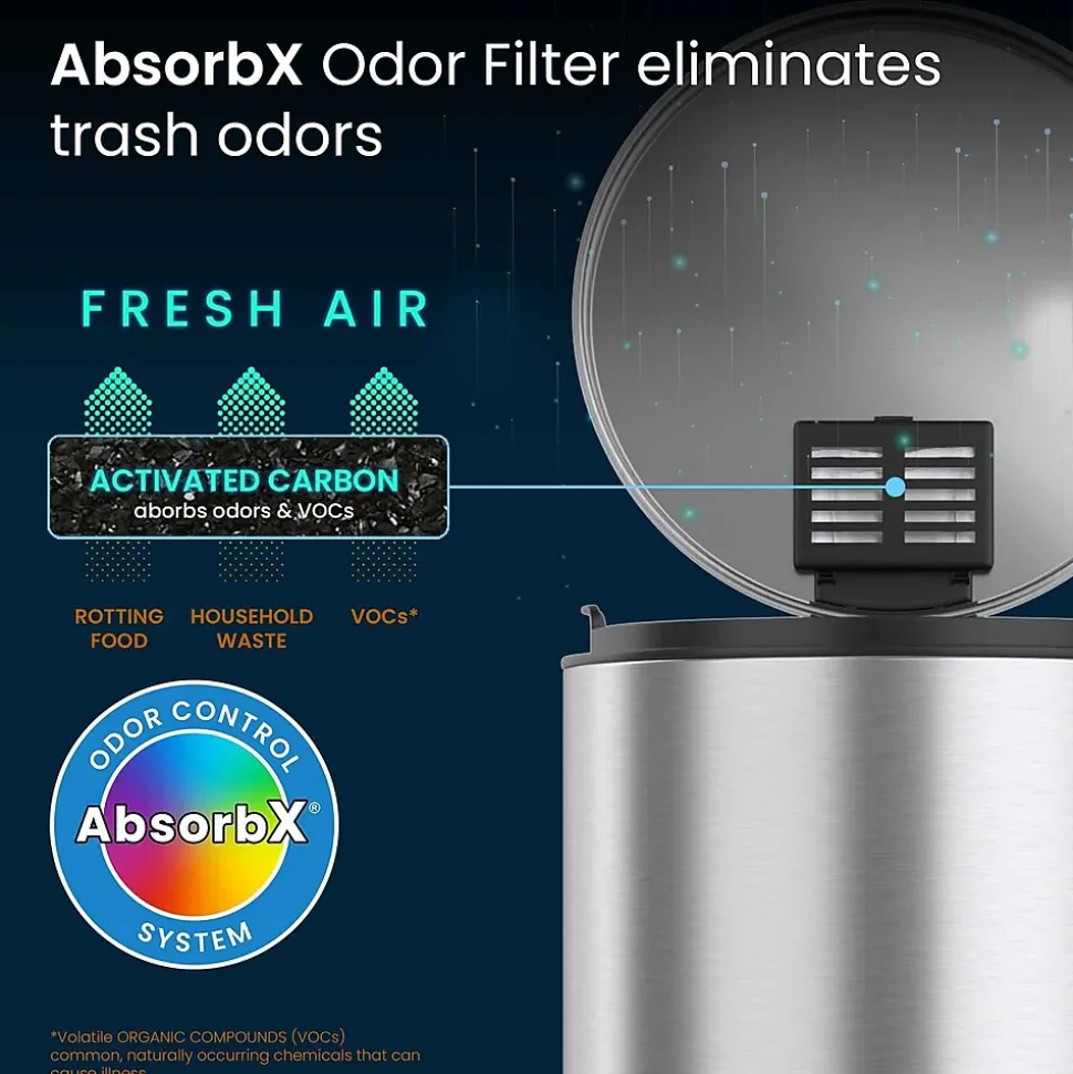 This iTouchless SoftStep trash can features a versatile round shape and space-saving design that make it perfect for the kitchen. The can is made of elegant fingerprint-proof stainless steel and comes with an AbsorbX natural carbon odor filter.