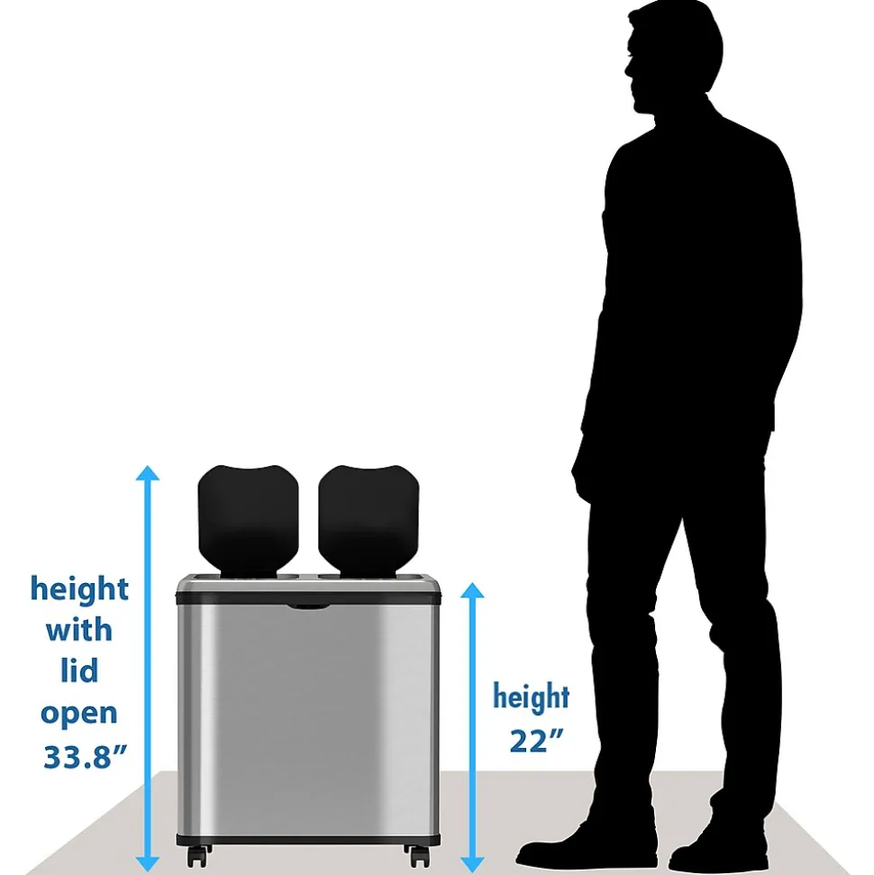 Premium features include two removable inner buckets for separate disposal of trash and recyclables, fingerprint-proof finish, and removable wheels for easy mobility.
