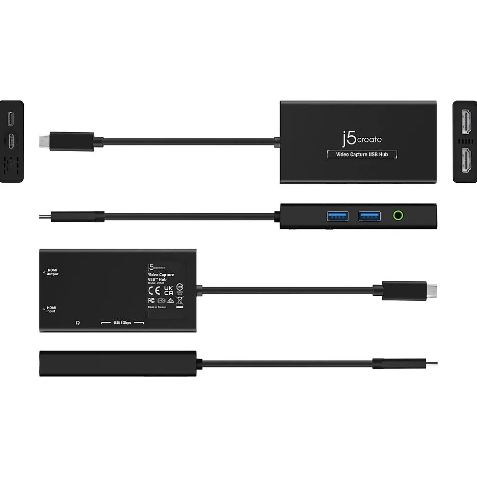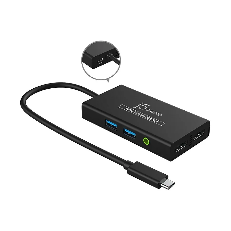 The j5create video capture USB Type-C hub is a dual-purpose device that combines an HDMI capture card with a USB Type-C hub. With the 1080p video capture and 4K USB Type-C display, as well as Power Delivery 3.0, you can stream in UHD without interruptions while charging your connected device. Includes two SuperSpeed USB 5Gbps ports for further peripheral connectivity. The compact and lightweight design makes this video capture hub perfect for mobile streaming. When not used for streaming, the device acts as a standard USB Type-C hub, allowing you to add two additional USB peripherals and a 4K HDMI display. Supports upstream charging to keep your laptop powered while in use.