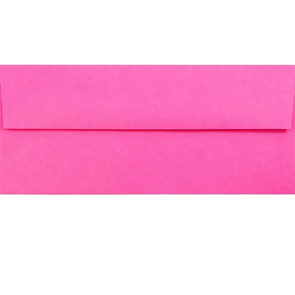 JAM Paper Brite Hue Ultra Fuchsia Hot Pink #10 Business Envelopes are made out of high quality, smooth, 24lb. paper and measure 4 1/8 x 9 1/2 inches each. This pack contains a total of 100 envelopes. Each envelope in this pack features a bright a vibrant fuchsia pink color that cannot go unnoticed in any setting! These envelopes have straight flaps and reliable gum colures to keep the contents within secure as they travel through the mail. Sized perfectly for three-time-folded standard sized sheets of paper, these envelopes can be used to send letters, documents, announcements, show tickets, and much more!