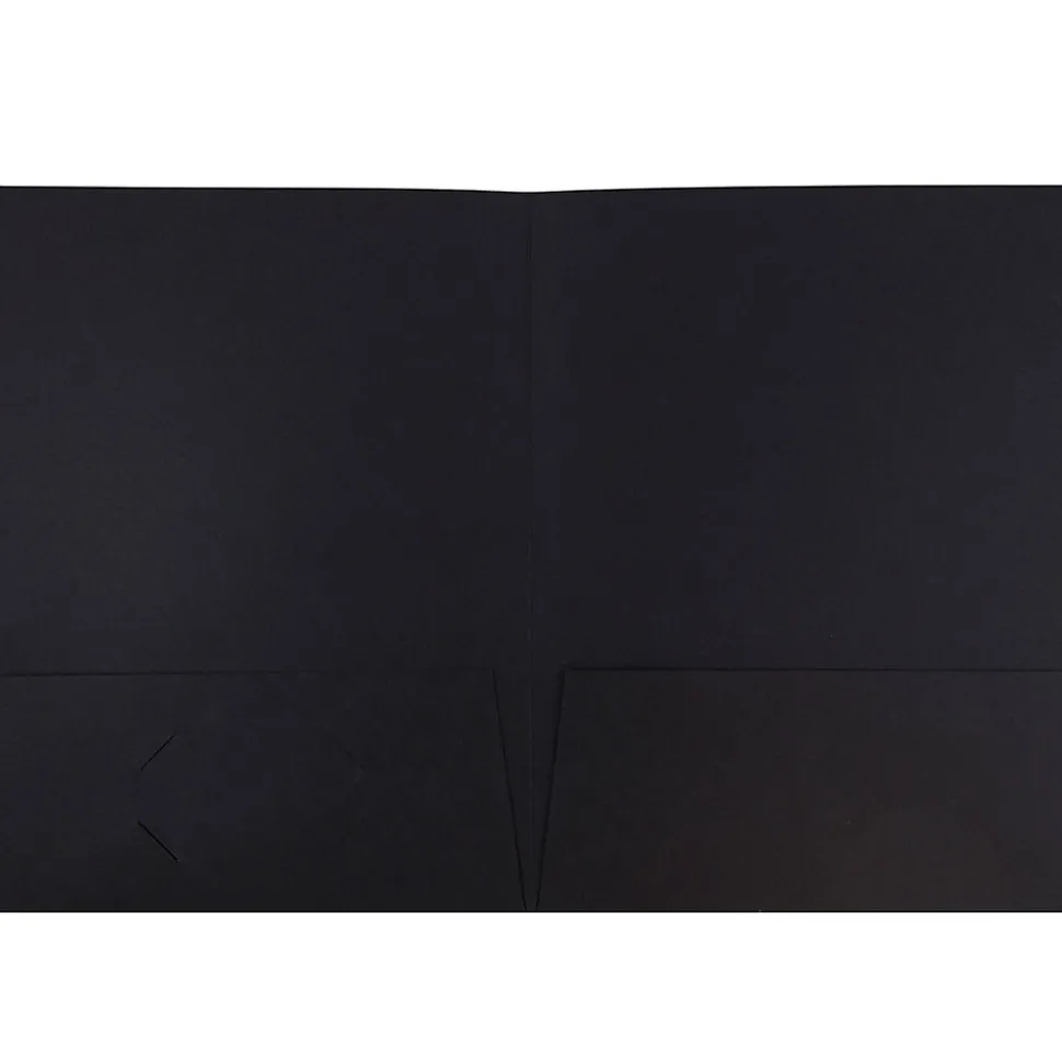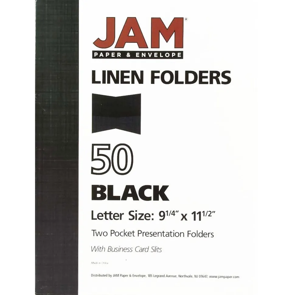 JAM PaperĀ® Black Linen Two Pocket Presentation Folders are made out of durable 30% recycled 100lb cardstock and feature a smooth, linen texture. These folders are sold in packs of 25 and measure 9 x 12 inches in size, making them ideal for standard sized sheets of paper. Each one features two pockets on the inside. Each left side pocket features a 3.5 x 2 inch business card slot. The jet black color and refined quality of these folders gives them a professional appearance that will look from in interviews, offices, academic settings, and more. Use them to store and organize your documents, or to transport them securely from place to place.