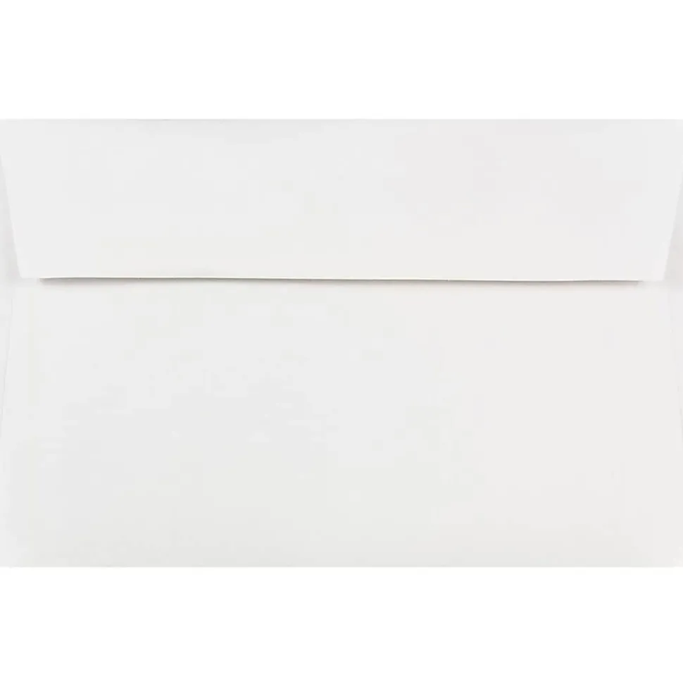 JAM PaperĀ® A9 White Booklet Envelopes offer a high quality way to send larger mailings. These 5 3/4″ x 8 3/4″ white envelopes can be used to send a variety of mail such as catalogs, invitations, greetings, announcements, documents, flyers, marketing materials, and thank you cards. There’s no need to bend or fold your contents, as they fit comfortably inside these spacious envelopes. Appropriate for home, classroom, and office use. However you use, expect high quality performance and efficacy. This pack contains 25 white booklet envelopes made from 24 lb. paper. Each envelope has a booklet opening, straight flap, gum closure, and smooth finish.