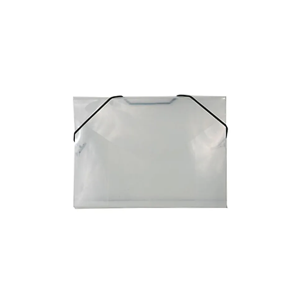 JAM PaperĀ® Clear Index Size Portfolio with Elastic Closure measures 5 1/2 x 7 1/2 x 3/8 inches in size and is made out of smooth and durable transparent plastic. Sold individually, this clear portfolio case is great for keeping, organizing, and protecting indexes cards, notes, and more in any office, work space, or home. Its size makes it create for those flash cards you made for that upcoming test or for those keep-sake post cards from far away relatives. This portfolio has a rounded flap and an elastic band closure. A black strand of elastic string is attached at the back near the top and at the sides. The two loose portions of this string stretch around the front of the top two corners of the case to keep it closed.