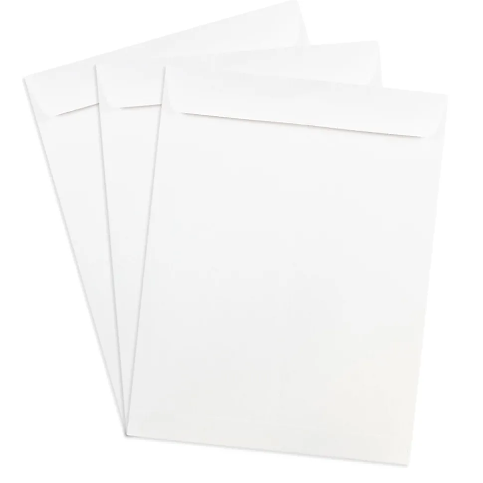 JAM PaperĀ® White 9 x 12 Open End Catalog Envelopes with Gum closures are a quality and versatile choice for a number of personal and professional mailing purposes! These straight flap, open end envelopes measure 9 x 12 inches in size, making them ideal for standard sized sheets of paper. Use them to mail forms, documents, business letters, and more from your office or home! These envelopes feature dependable, moisture activated gum closures to keep items secure as they travel through the mail. This pack contains an even and convenient total of 50 envelopes! Use them for next mailing endeavor! Size: 9in x 12in – Color: White – Quantity: 50