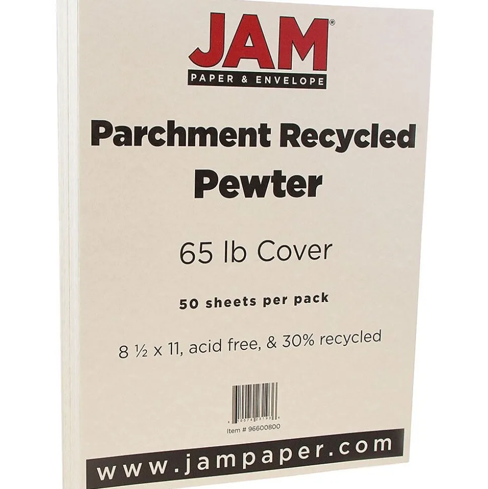 JAM Paper Pewter parchment recycled cardstock cover measuring 8 1/2″ x 11″ is perfect for your invitations, stationery, business mail and promotional material. Cover is created from 30 percent post consumer paper and is sold as 50 per pack.
