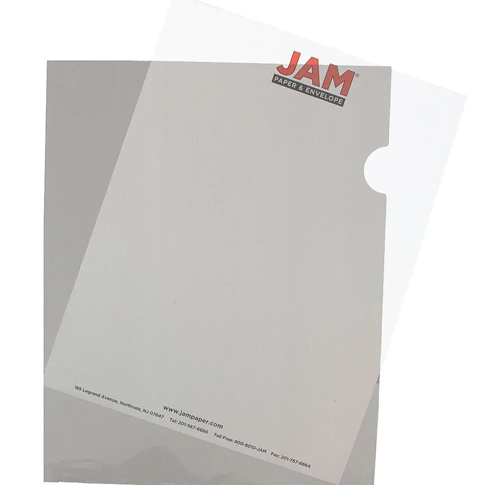 For protecting your documents reliably in a place you can see them, JAM Paper® Smoke Plastic Sleeves are an excellent option! These 9 x 11.5 inch sleeves are made out of smooth, light weight, non-stick, acid free, moisture resistant, transparent, grey-tinted poly plastic. This pack contains 120 sleeves!The left edge and bottom edge of each one is permanently sealed closed to keep documents in place. The top and right edges are open so that you may slide documents in and out with ease. There are two indented notches in the right side that assist with lifting the front cover to place documents inside. The subtle smoky grey color of these sleeves can help them stand out among white sheets of paper.