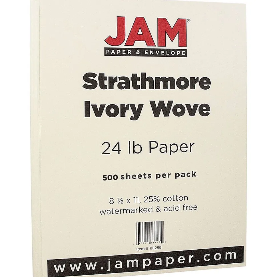 JAM Paper® Strathmore paper comes with ream of 500 sheets in ivory wove color which is made out of 25% cotton are perfect for any invites and available in 24lb paper and 80lb cover.