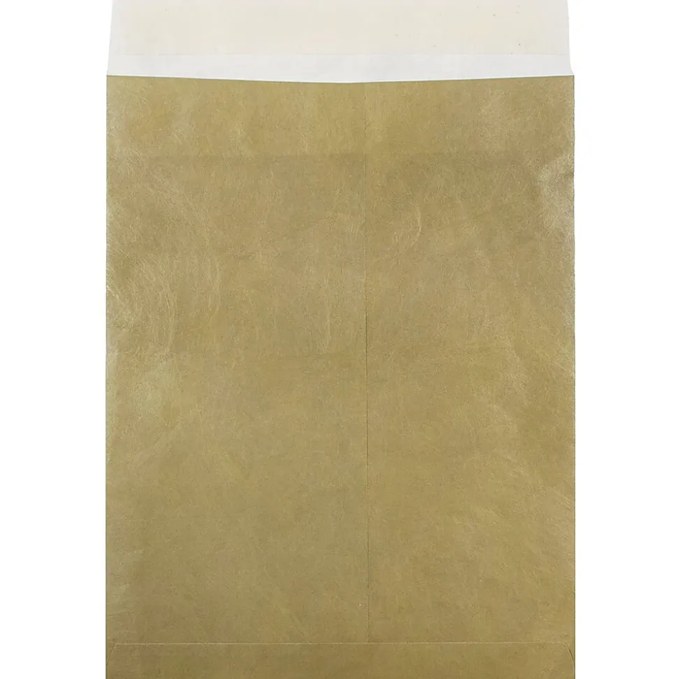 JAM Paper® Gold 10 x 13 Heavy Duty Tyvek® Open End Catalog Envelopes are made out of smooth, 10% recycled, certified Tyvek material. Tyvek is a registered trademark of DuPont, the established company responsible for developing this durable polymer. It is composed of high-density polyethylene fibers, a synthetic material that is extremely hard to rip and tear. These envelopes a feature shining gold color that gives them an appearance that is great for holiday and special occasion related mailings. This pack contains 25 envelopes. Each one measures 10 x 13 inches in size, making them ideal for enclosing standard sized and slightly larger documents with no need for folding. These envelopes have straight flaps and secure self-adhesive strip closures.