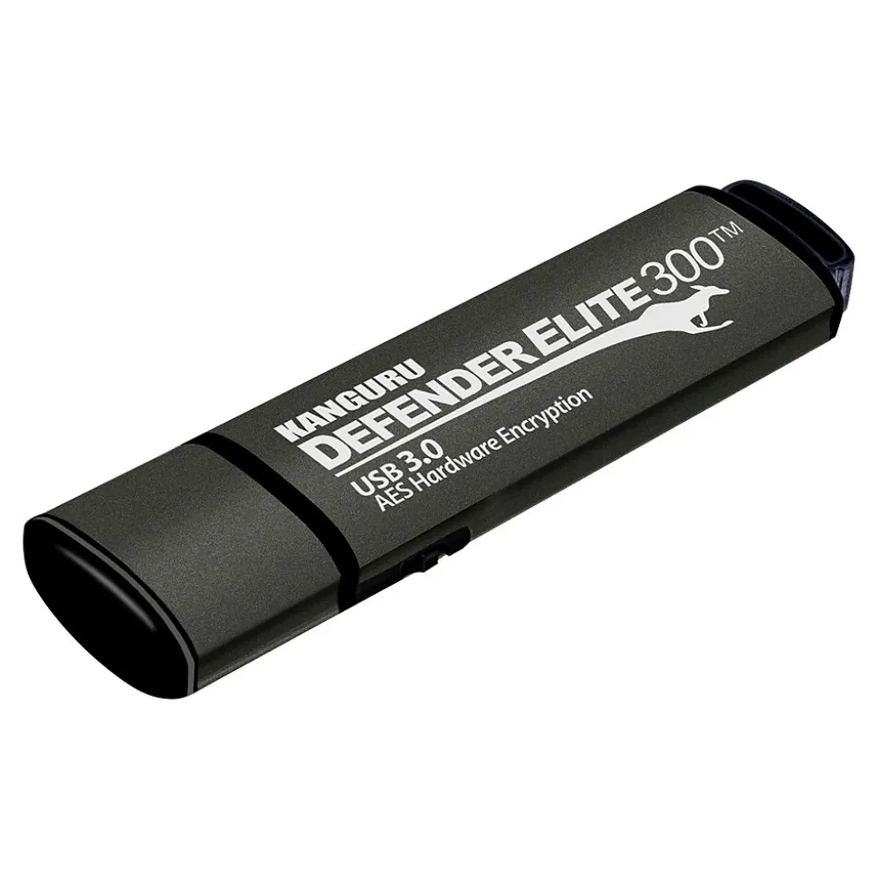 The Kanguru Defender Elite300 SuperSpeed USB 3.0 secure flash drive is designed for high data security organizations looking to meet the most demanding regulatory security standards. With military grade AES 256-bit hardware encryption (using XTS Mode), lightning-fast USB 3.0 transfer speeds, FIPS 140-2 Level 2 certification, onboard, world-class, AntiVirus by BitDefender, tamper-resistance, and remote management capabilities, the Defender Elite300 is perfect for high security environments, including government, healthcare and financial industries. The Defender Elite300 complies with the Trade Agreements Act (TAA Compliance). The Defender Elite300 has a handy physical write protect switch to easily switch between read/write and read-only protection if desired. Furthermore, all Kanguru Defender USB drives are fully protected from potential risk of “BadUSB” with digitally- signed RSA-2048 secure firmware.
