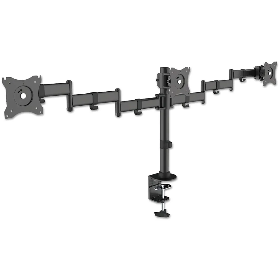 Fits monitors up to 27″ and up to 18 lbs. per monitor. Height easily adjusted for an optimal ergonomic position. Fully articulating design provides 360-degree rotation, 180-degree swivel and ±45-degree tilting for any viewing perspective. Cable clips for cable management. Monitor arm attaches to the desk, via a clamp or grommet (both included).