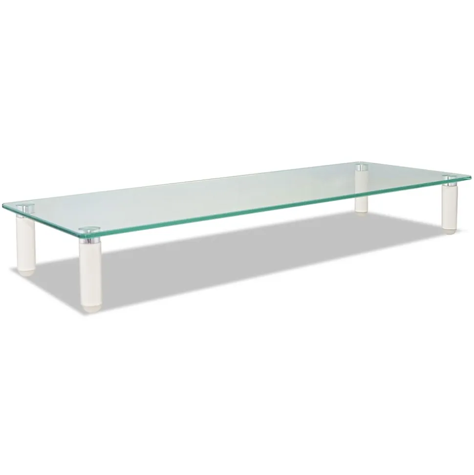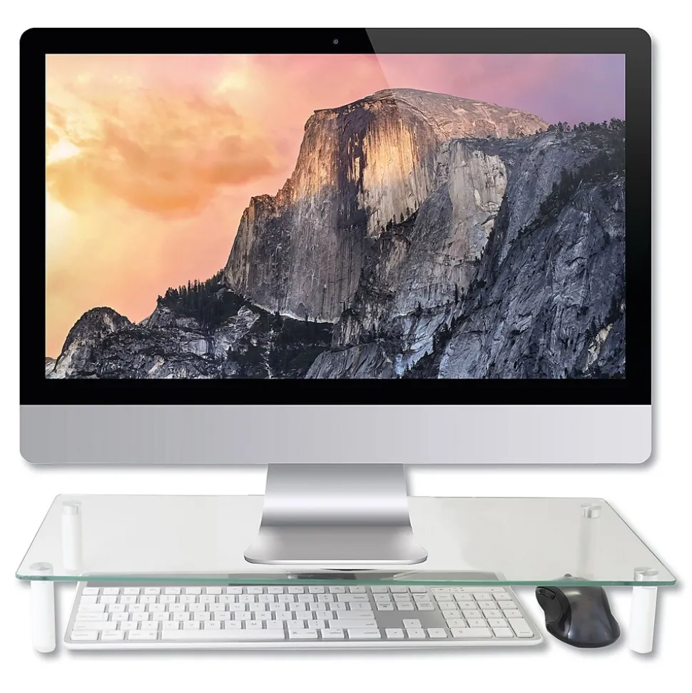 Ample space to place accessories and store keyboard underneath. Tempered glass. Non-skid feet. 40 lb. capacity. Elegant contemporary design.