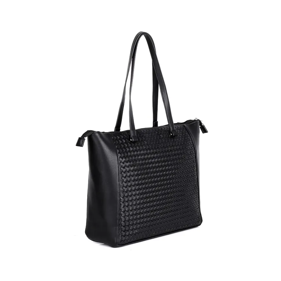 The Karla Hanson Tanya tote bag is chic and practical in equal measure, featuring a versatile, roomy design. Made of smooth vegan leather with soft and durable handles, the Karla Hanson Tanya tote bag can be carried in any way, including on the shoulder, on the elbow, and in the hand. The woven design adds texture and flair effortlessly. It is a must-have accessory for easy everyday elegance. Features an RFID-protection pocket that protects your identity and credit cards. With a zipper closure, the roomy pocket can hold your wallet, cell phone, passport, travel documents, and more.