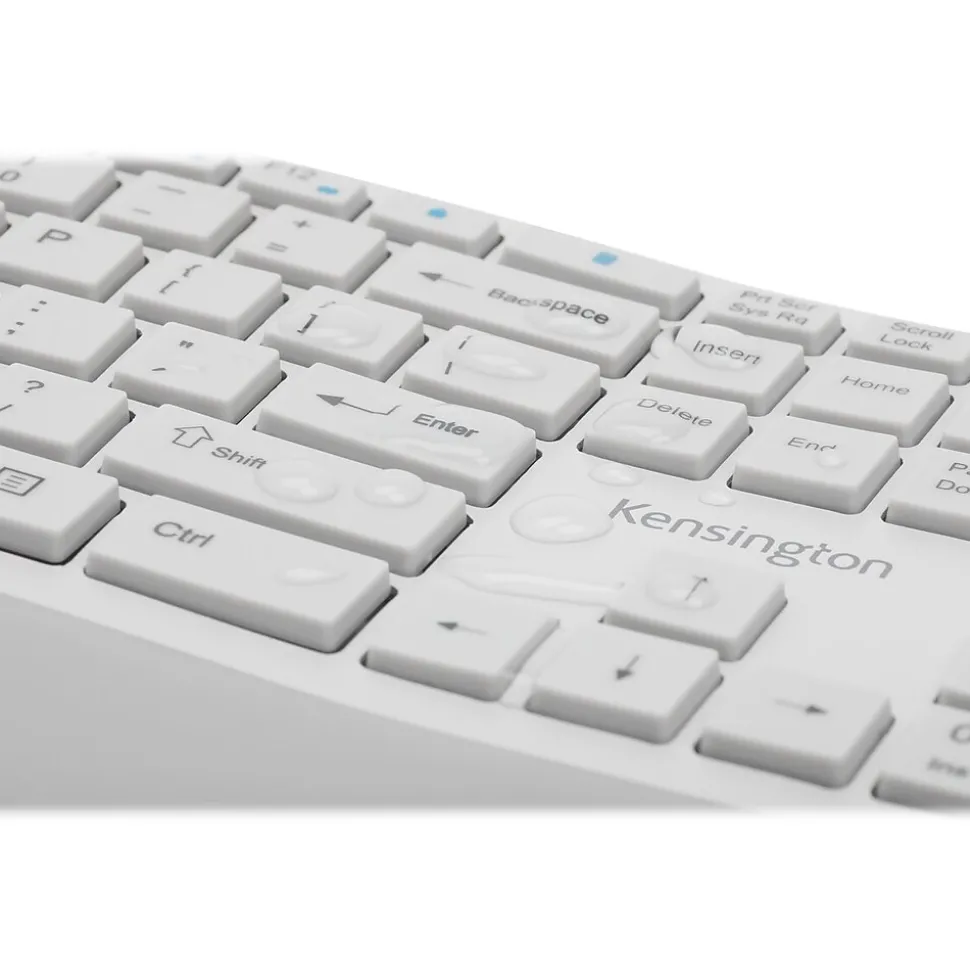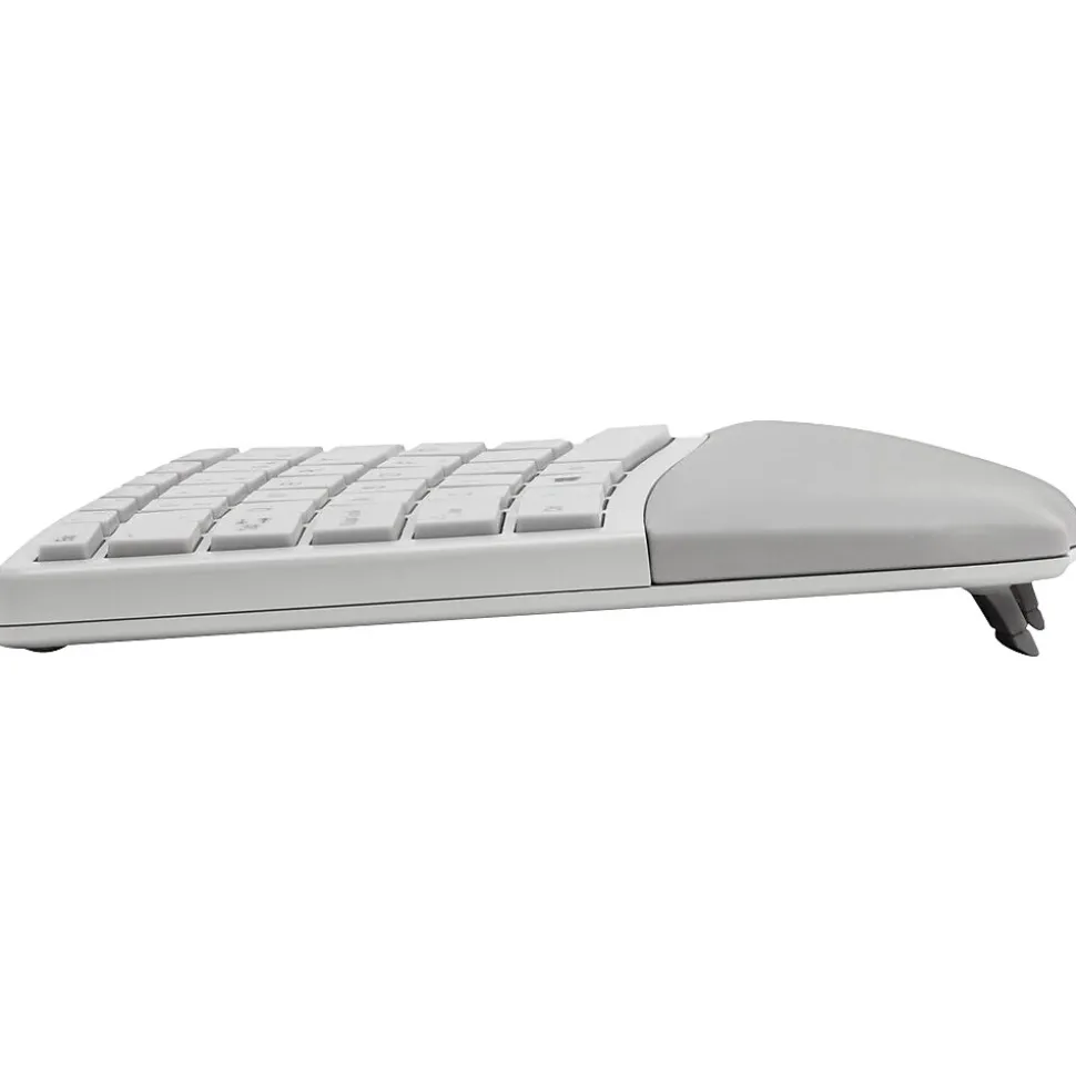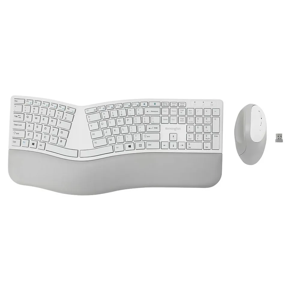 The Kensington Pro Fit Ergo split and sloped keyboard comes with adjustable reverse tilt, built-in wrist support, and neutral grip. The ergonomist-approved wireless keyboard and mouse position your hands for improved comfort. The features include dual wireless connectivity (2.4GHz and Bluetooth 4.0 LE) with 128-bit AES encryption security; quiet typing and clicking; spill-proof keys; F-keys for shortcuts; caps lock, number lock, and scroll lock; low battery indicator lights; a five-button (including forward and back) mouse; three-mode power-saving switches; and a replaceable receiver. In the event the receiver is lost or damaged, simply purchase a new one, pair it with your mouse, and you’re all set.
