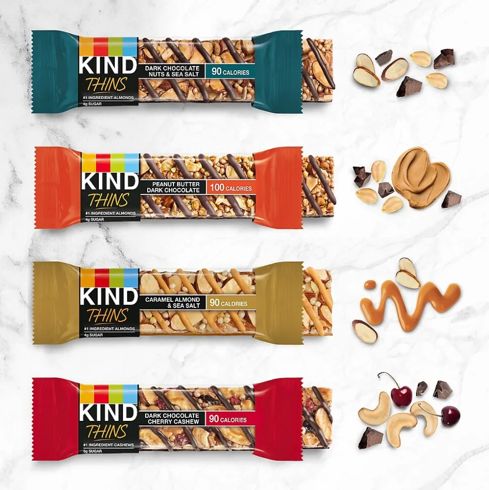 These KIND Thins bars are made with almonds, contain 100 calories or fewer per bar, 0.14 oz. of sugar, and are gluten-free. The thin layer of sliced and diced nuts is paired with a sweet chocolaty or caramel coating layered on the bottom and finished with a drizzle on top for a rich and indulgent experience.