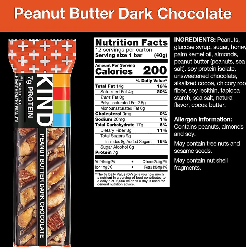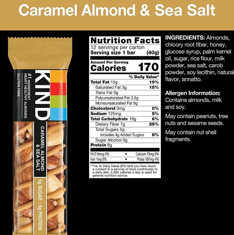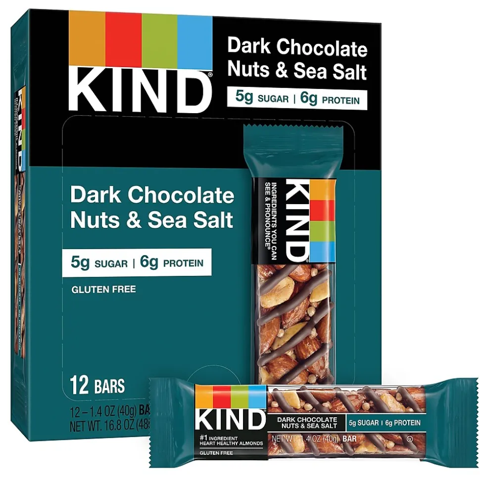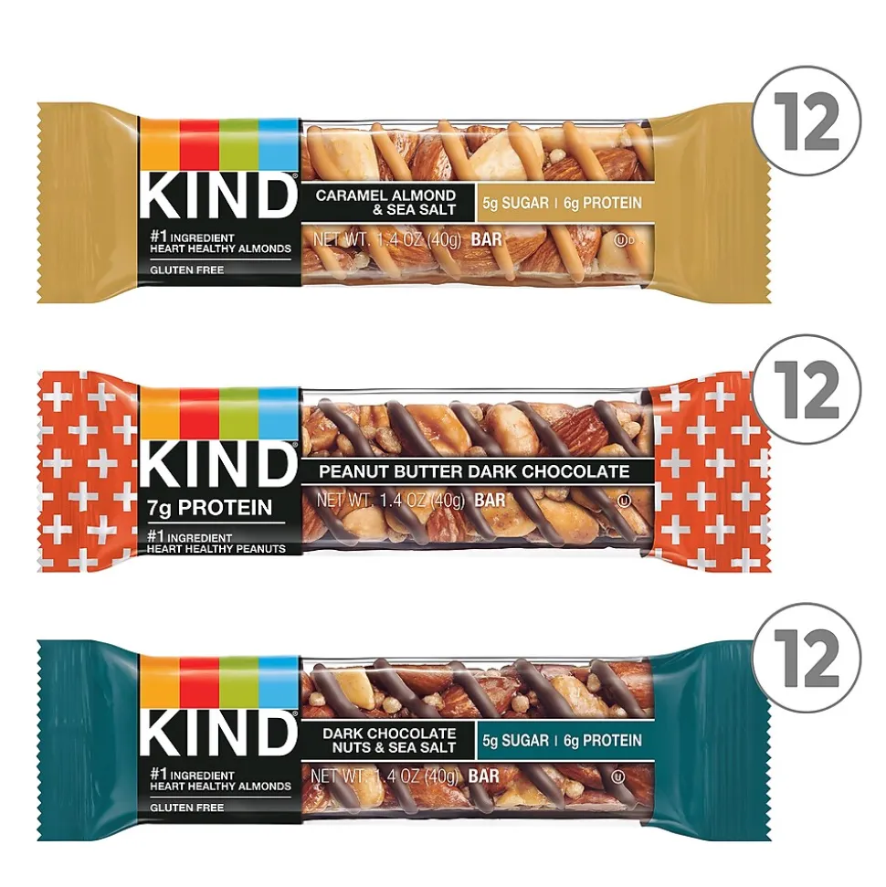 - Pack includes 12 KIND Dark Chocolate Nuts & Sea Salt 1.4 oz bars, 12 Peanut Butter Dark Chocolate 1.4 oz bars and 12 Caramel Almond & Sea Salt 1.4 oz bars for a total of 36 nutritious bars