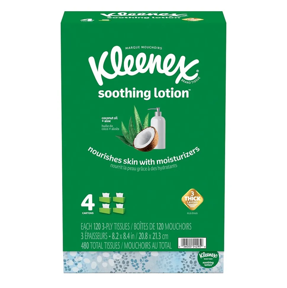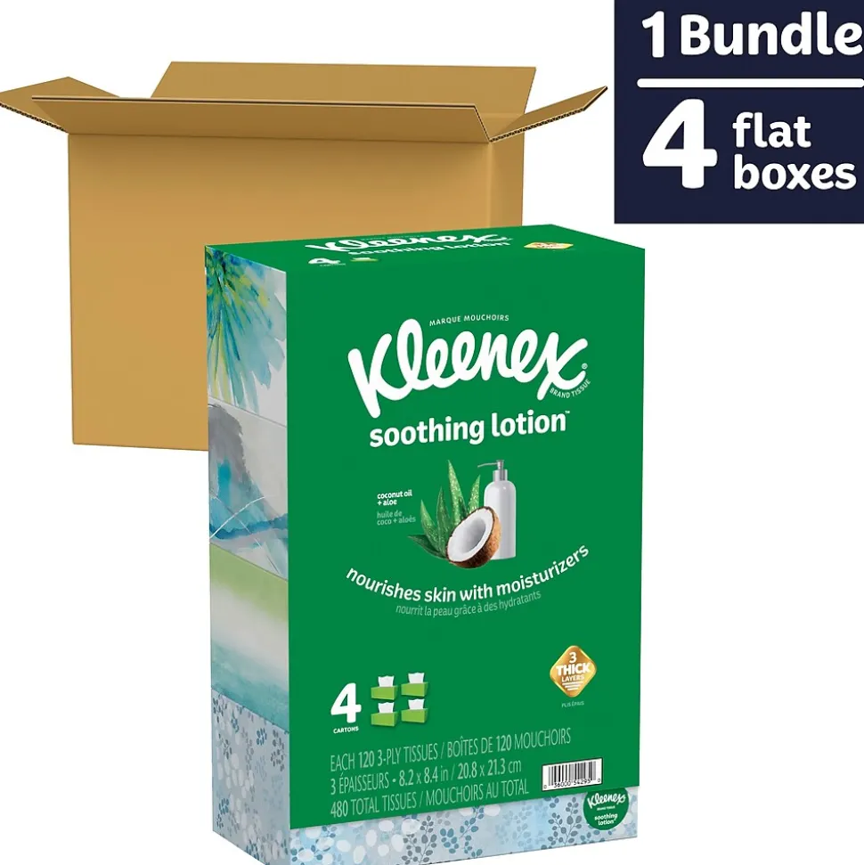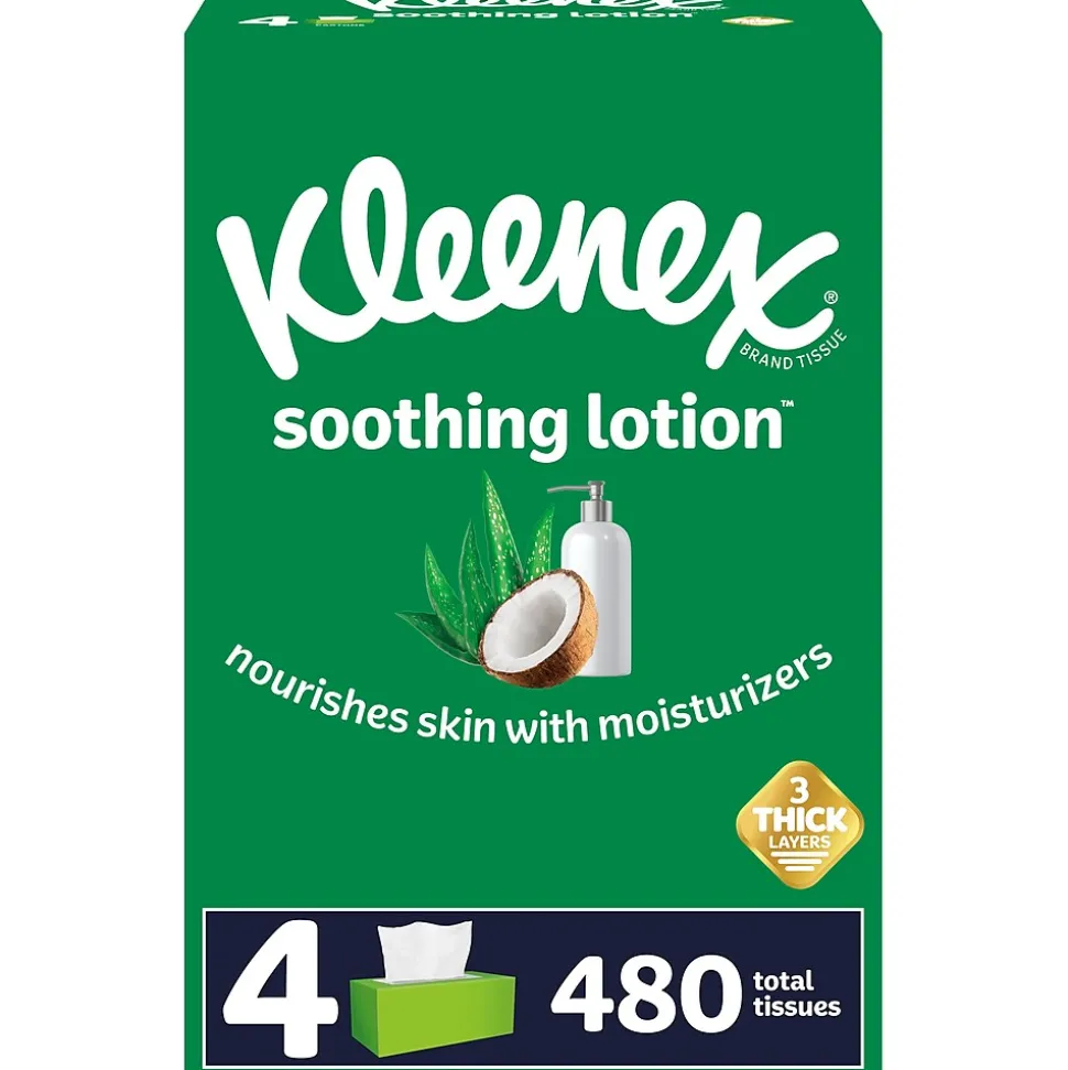 Wipe the skin delicately with these soft fragrance-free two-ply facial tissues. The moisturizing properties of aloe vera and vitamin E keep the skin hydrated and healthy. Each flat box in this four-pack of Kleenex soothing lotion facial tissues contains 120 two-ply sheets for lasting supply in dressing rooms, luxury hotel rooms or bathrooms.