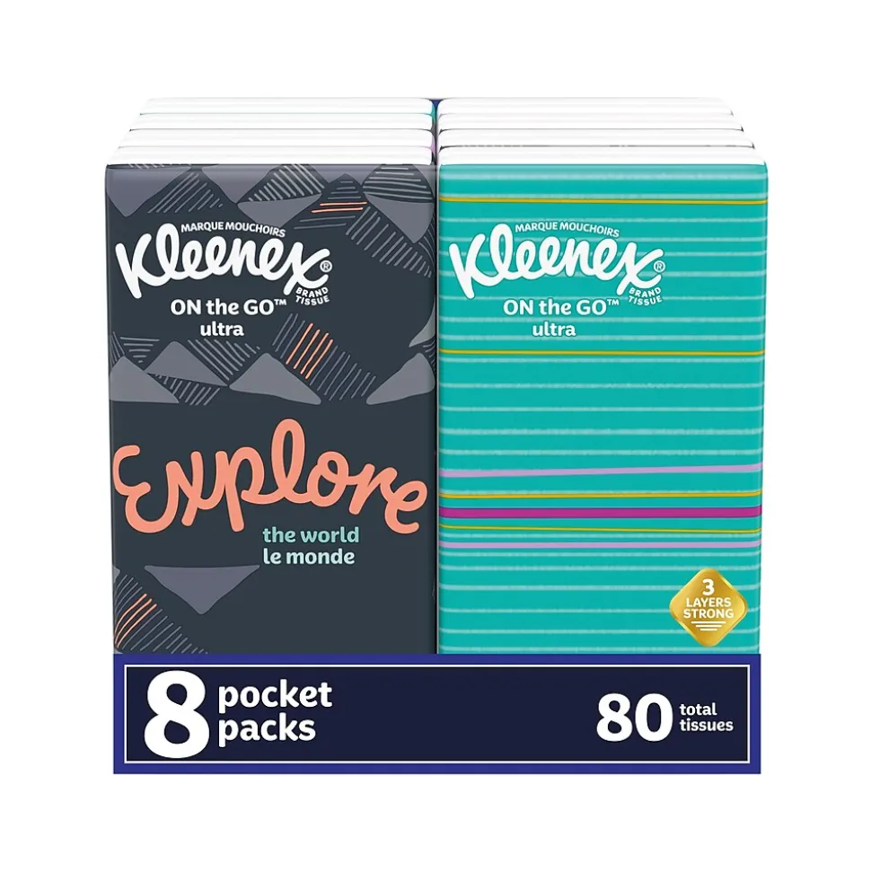 The Kleenex On the Go Ultra three-layer tissue is soft, durable, and thick and comes in a convenient travel pack that is small enough to fit in pockets, purses, backpacks, or travel bags. The to-go box’s design contains various colors and designs. Produced from 100% responsibly managed forests.