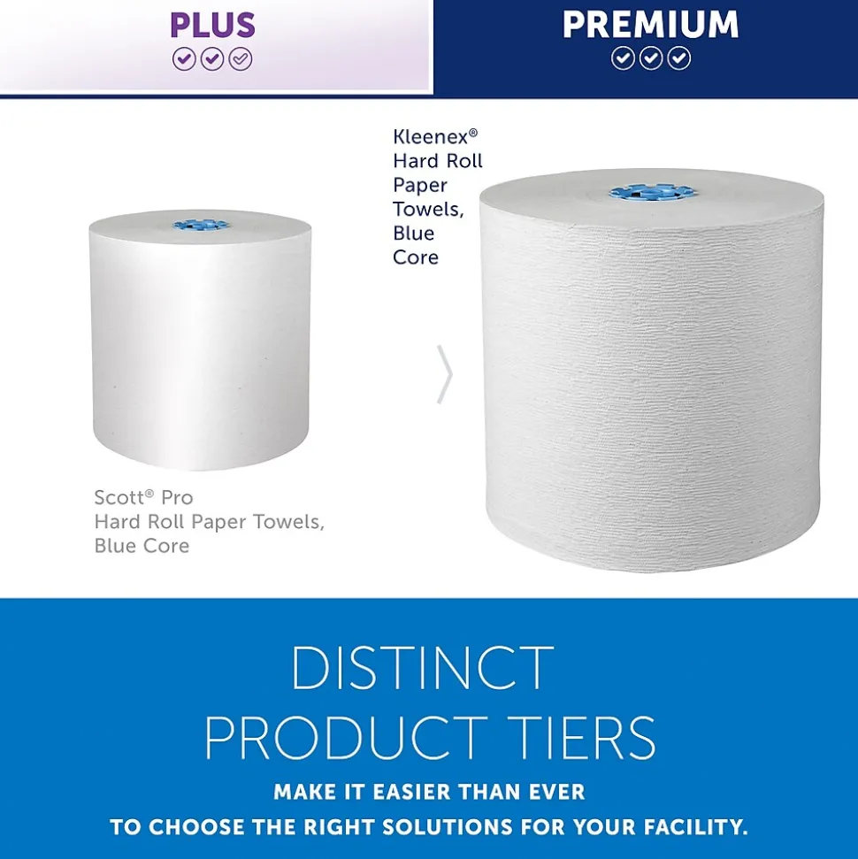 - 700’/Roll, 6 Kleenex® Hard Roll Paper Towel Rolls/Case; 4,200’/Case; with Premium Absorbency Pockets™; for Blue Core Dispensers; White; compatible exclusively with Scott® Pro™ Automatic Hard Roll Towel Dispenser