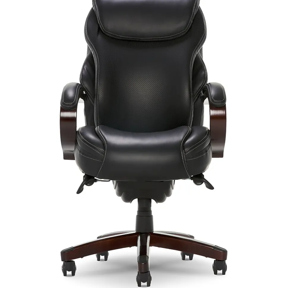 Trusted Quality and Craftsmanship From a trusted brand known for quality, traditional craftsmanship and comfort, the La-Z-Boy Hyland ComfortCore Traditions AIR Technology Executive Office Chair delivers advanced performance for exceptional support and comfort at work and play. Superior Comfort Technology The ComfortCore Plus with Memory Foam advanced layering system offers unique zone-based support, placing cushioning in the areas you need it most. The strategically-assigned plush body pillowing and padded headrest on this office chair combine to provide neck support and minimize pressure points for relief from discomfort caused by prolonged sitting. Ergonomic Design and Lumbar Support Technology This Wellness By Design series La-Z-Boy office chair uses flexible AIR Lumbar Technology that pivots and conforms the lumbar area according to your movement, helping to improve posture, reduce discomfort and provide superior back support. This ergonomic chair is fully adjustable, letting you control height, tilt and lift to suit your needs for customized positioning and optimized body alignment. Built to Last This executive office chair features a thicker plywood subcore, reinforced back bar and heavy-duty castors for durability you can count on for all your day-to-day activities. Traditional Style, Contemporary Functionality Crafted with wood components, this high-back office chair with hand-sculpted arms is upholstered in soft bonded leather to create an elegant blend of traditional style and modern performance that is ideal for any office, home or entertainment space.