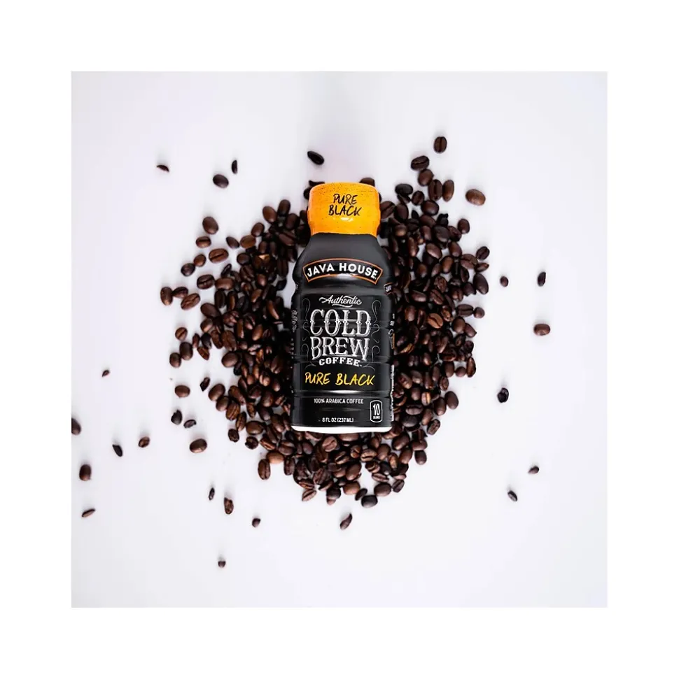 Get up and go. You called for ready-to-go bottles and Java House answered. This 8 fl. oz. Pure Black cold brew bottle is convenient, delicious, and packs a caffeinated punch. Authentically crafted cold brew, with 100% arabica coffee and natural ingredients.