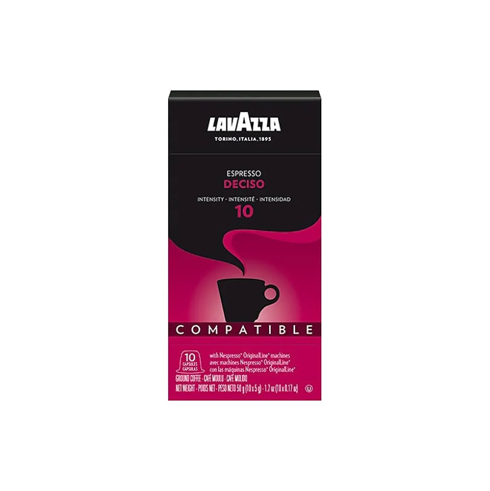 Lavazza Espresso Deciso is born out of the combination of Brazilian and Southeast Asian beans: a soft and full-bodied Brazilian coffee with oriental notes of cocoa and wood for a blend of intense and velvety flavors. The coffee capsule is compatible with Nespresso Original machines.