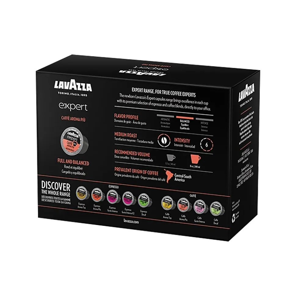 Full and balanced, with gentle hints of roasted cereals that arise in the medium body of its aroma. The Lavazza Expert Caffe Aroma Piu arabica from Central and South America gives a full taste, with an elegant balanced character.