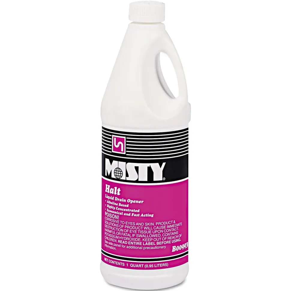 Misty® Concentrate halt liquid drain opener bottle keeps drain lines clear and free-flowing to reduce offensive odors. Halt liquid drain opener bottle is featured with highly concentrated alkaline-based formula.
