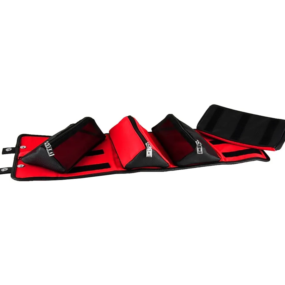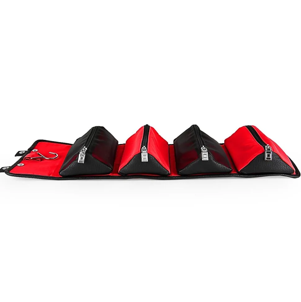 The Stowaway makes organizing a simple process. Use it for multiple end uses: travel, toiletry storage, makeup kit, cable and tech organizer, etc. Unrolling the Stowaway unveils the organizer pouches. Each pouch is removable and the exterior cover can be folded or placed flat when transporting inside other luggage. Equipped with a metal hook, the Stowaway can be hung upright. Weather resistant
