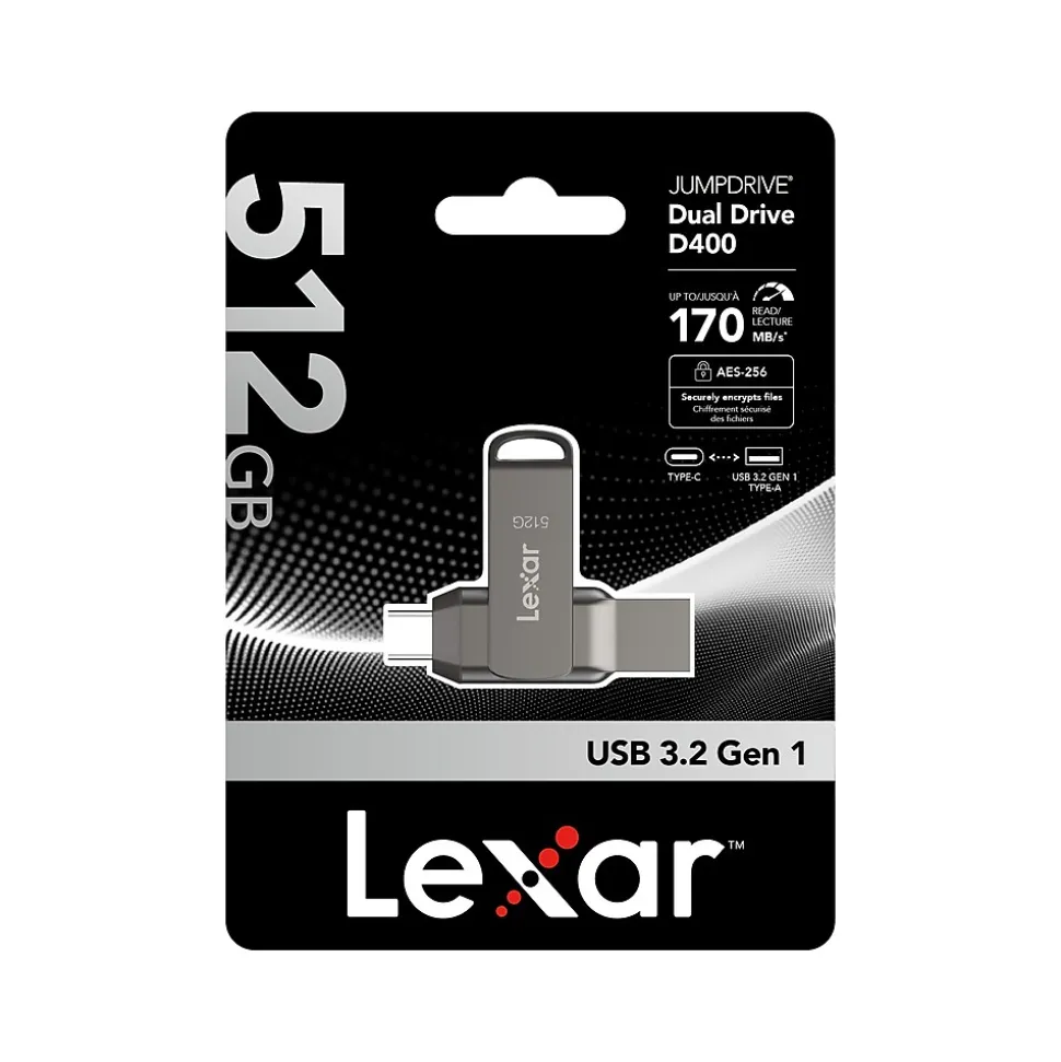 The Lexar JumpDrive D400 USB 3.2 Type-C is a two-in-one flash drive that allows you to seamlessly transfer content between your USB Type-C and Type-A devices. Featuring a stylish metal casing and swivel design for added protection, this drive is as tough as it is fast, with transfer speeds up to 170MB/s.