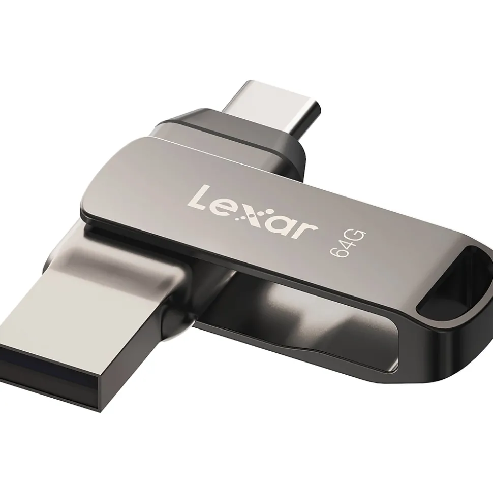 The Lexar JumpDrive D400 is a two-in-one flash drive that allows you to seamlessly transfer content between your USB Type-C and Type-A devices. Featuring a stylish metal casing and swivel design for added protection, this drive is as tough as it is fast, with transfer speeds up to 130MB/s.