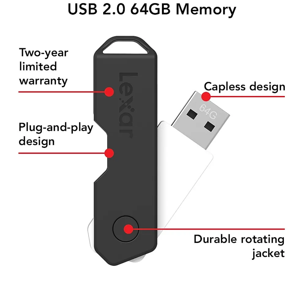 The Lexar JumpDrive TwistTurn2 flash drive has a simple plug-and-play design that allows you to quickly and easily store files, so wherever you go, your information goes with you. JumpDrive TwistTurn also works across platforms, giving you flexibility and ease of use. This stylish and high-capacity drive sports a capless design with a durable hinged jacket that rotates to easily access a USB port or protect your files. PC & MAC Compatible. Two-year limited warranty.