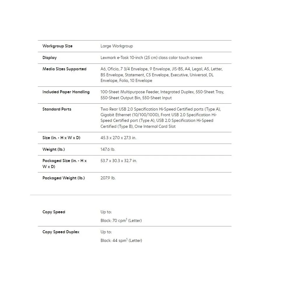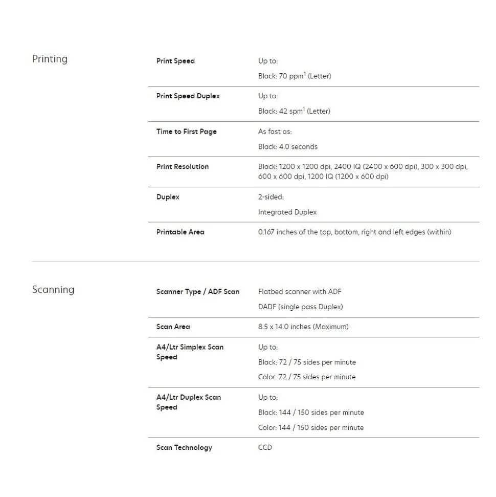 | Automatic Document Feeder (ADF) Print Speed, measured in pages per minute (PPM), specifies the amount of black and white pages that the printer can produce within 60 seconds. | 41 PPM & Up |