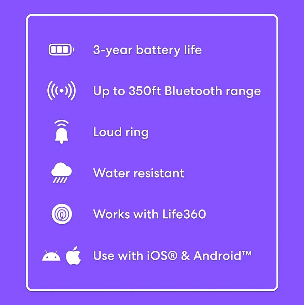 - Tech specs – 350-foot / 105m Bluetooth range. Up to 3-year non-replaceable battery. Water resistant (IP68 rated).