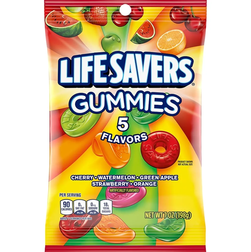 Grab these soft candies for a quick snack or add them to the office candy dish for a unique treat. Each bag of Life Savers gummy candies contains an assortment of bite-sized gummies in five classic fruit flavors, making it easy for everyone to find something they like.