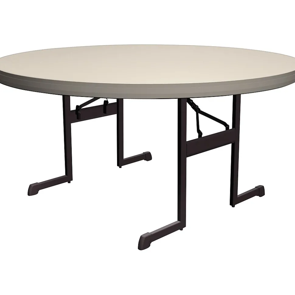 Lifetime 60″ Round professional folding table in putty finish has UV-protected high-density polyethylene top. Table measuring 29″ features rust-resistant powder-coated steel frame.