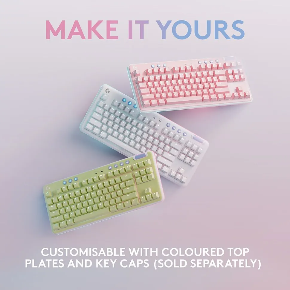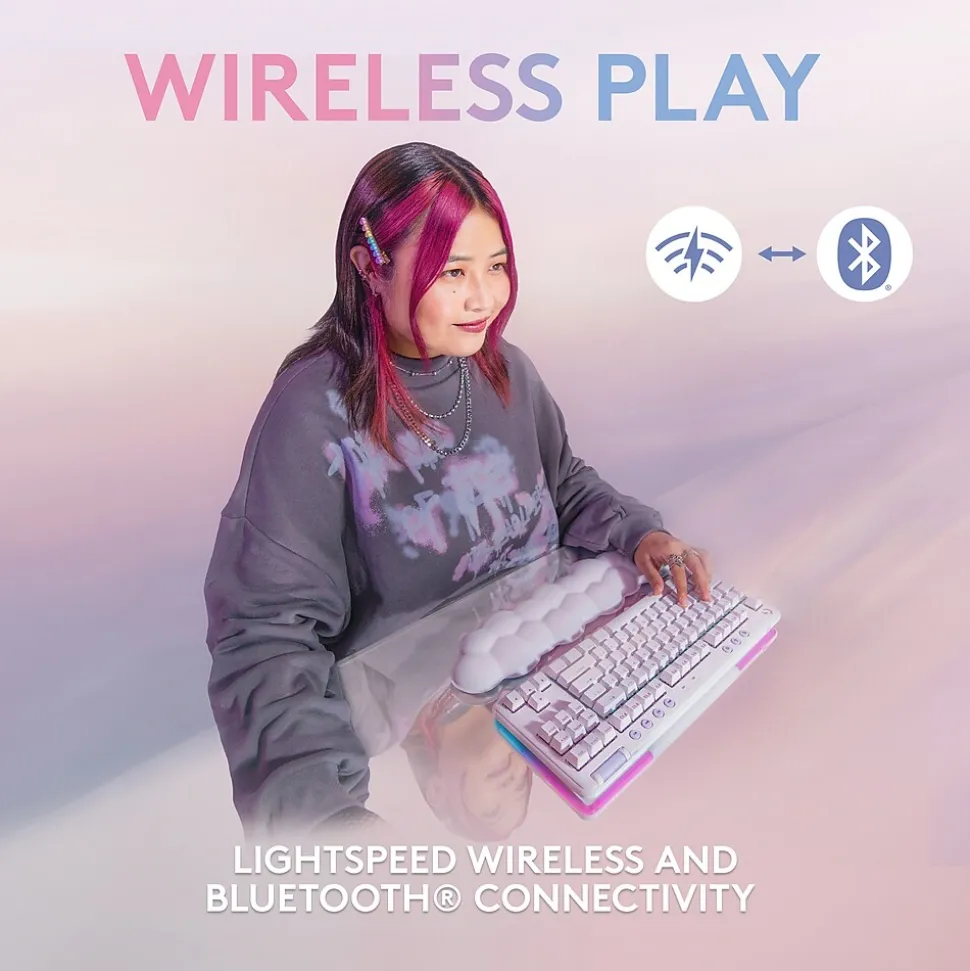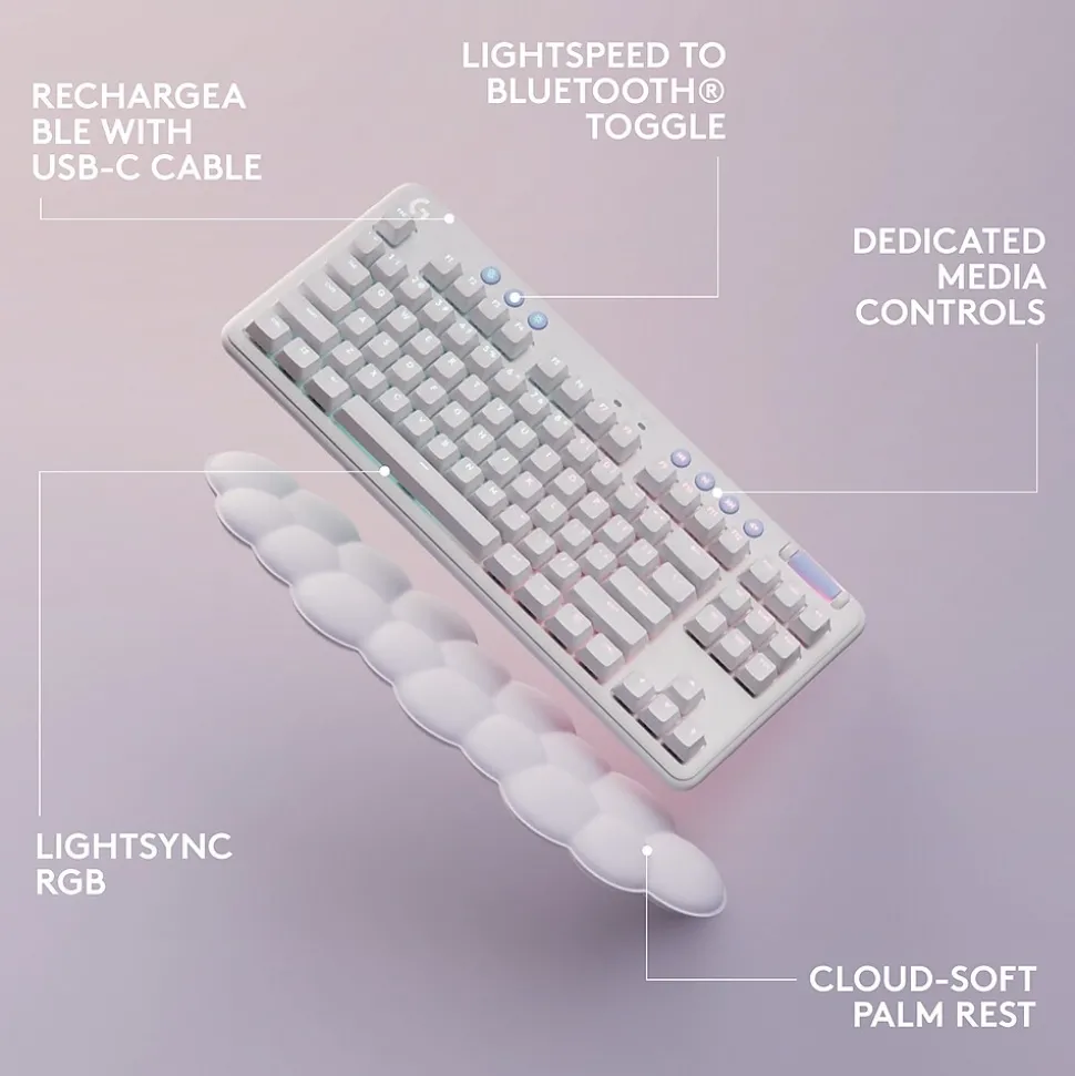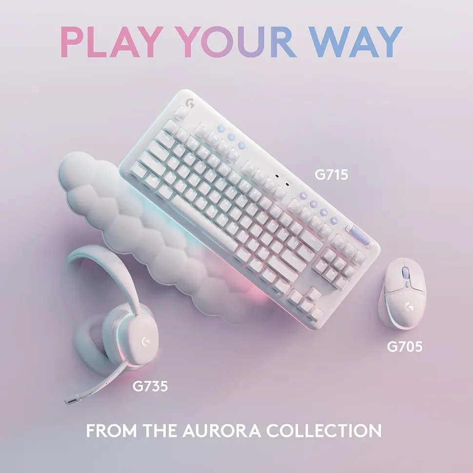 The Aurora G715 wireless gaming keyboard is a compact, comfy keyboard that delivers low-key vibes with high-key performance, so you can express yourself and play your way. Float away with the dreamy white design and cloud-soft palm rest. A compact, tenkeyless layout and adjustable height give that good game feeling, all-day long. Pack up the keyboard, place it anywhere, and play your best with a rechargeable 25-hour battery life and LIGHTSPEED wireless or Bluetooth connectivity. Show off your playstyle with ethereal LIGHTSYNC RGB on the keyboard perimeter and under the keys, along with out-of-the-box Aurora collection signature lighting.