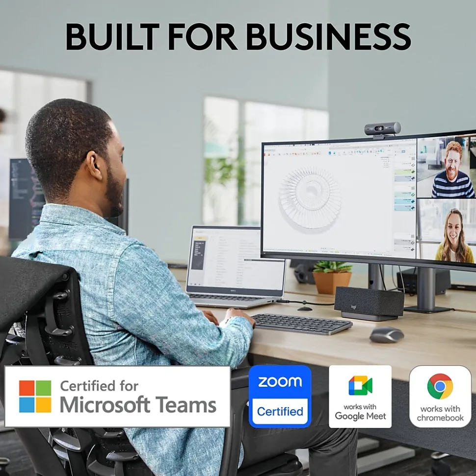 Confidently deploy flawless video meetings with Brio 505, a foolproof plug-and-play HD webcam packed with features that help employees look and sound natural during meetings. Advanced light correction, auto-framing, noise-reducing mics, and Show Mode make authentic meetings a breeze. Brio 505 is certified for Microsoft Teams, Google Meet, and Zoom, so it fits right into your IT ecosystem. You can also easily manage and update Brio 505 remotely with Logitech Sync and Logi Tune.