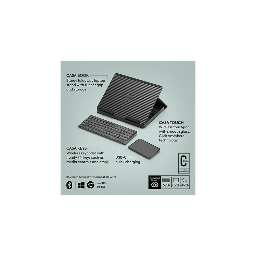 - YOUR WORK ESSENTIALS IN ONE COMPACT KIT: Logitech Casa has all you need to work from home in one compact kit, with a wireless keyboard, wireless touchpad, storage space for smaller items such as stationery and a book-like case that transforms into a laptop stand.