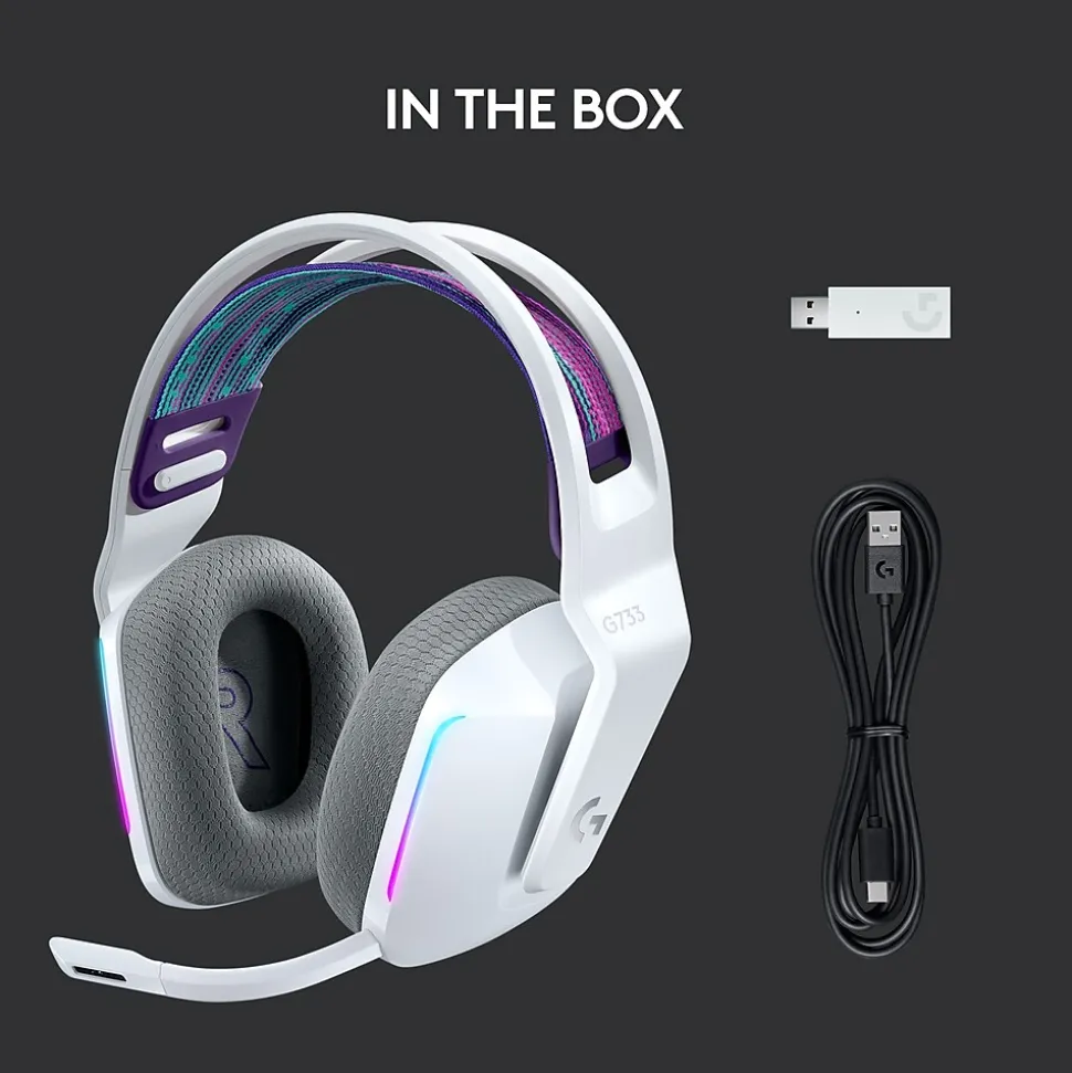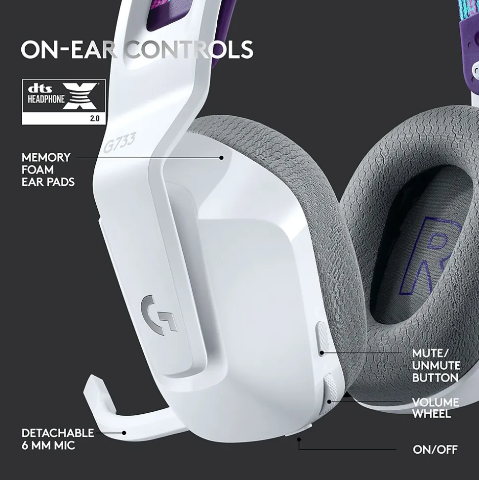 Meet Logitech G Series G733, a gaming headset designed to suit your style. Embrace total wireless with 2.4 GHZ LIGHTSPEED wireless, featuring up to 65′ of range and up to 29 hours of battery life. Customize how you look and sound in G HUB with dual-zone, front-facing lightsync RGB and Blue VO!CE real-time voice filters. Logitech G Series G733 features advanced audio technologies, including 40 mm PRO-G audio drivers, internal acoustic chambers, and DTS Headphone:X 2.0. Play in comfort with dual-layer memory foam earcups, suspension headband design and ultra lightweight headset at just 278 g.
