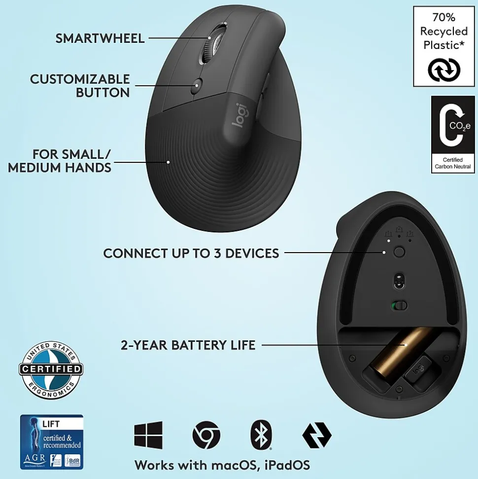 - Lift yourself up: When the desk life gets you down, lift yourself up with Logitech Lift Vertical Ergonomic Mouse – a great fit for small to medium left hands