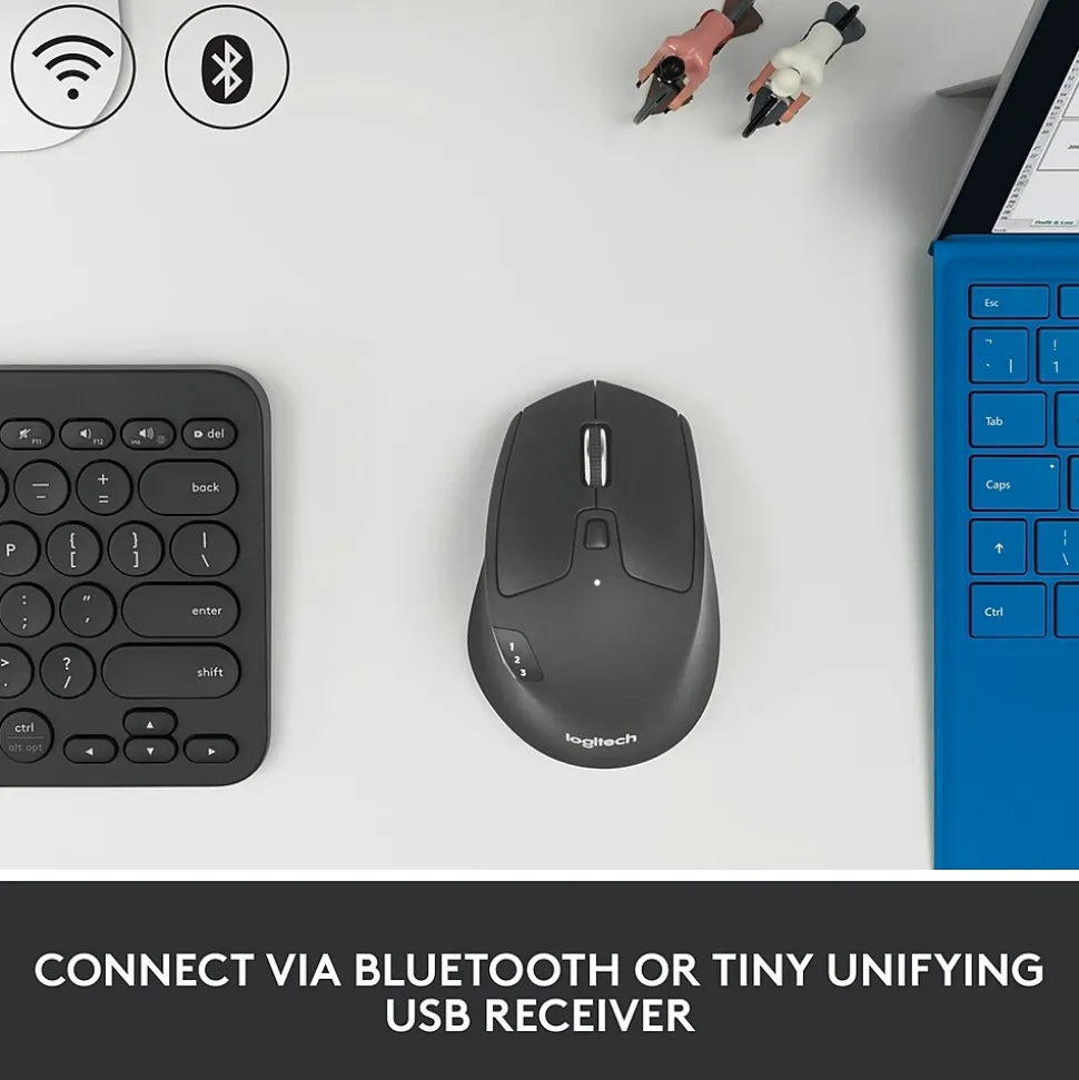 The Logitech M720 Triathlon wireless mouse features superior device connectivity with the ability to connect via both USB port and Bluetooth. The sculpted, ergonomic construction ensures comfortable use and puts the scroll wheel and buttons within easy reach. For even more personalized flexibility, the buttons are fully customizable. Simply press one button to effortlessly switch between three different computers without having to change any connections. To reduce office waste, this mouse can last as long as 24 months on one AA battery.