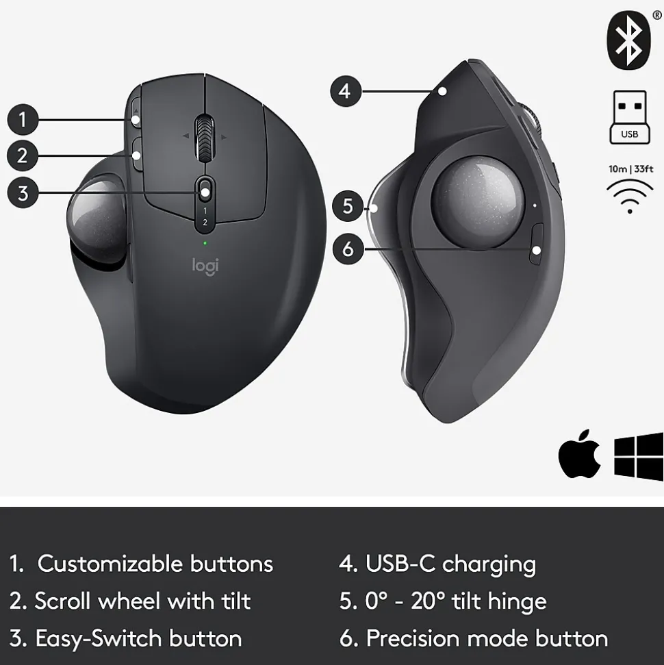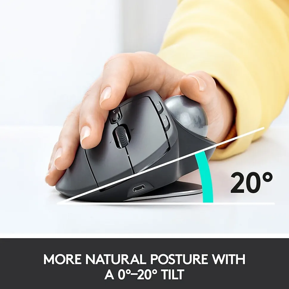A new standard of comfort and precision. Logitech’s most advanced trackball for trackball enthusiasts and consumers searching for alternatives to mice and touchpads. Delivers 20% less muscular strain compared to a regular mouse. A unique adjustable hinge plus extra 10° wedge offer customized comfort – choose the best angle for you between 0°, 20° and 30°. Precision mode button allows to instantly switch between speed and precise tracking. Easy-Switch™ and FLOW-enabled for effortless multi-computer workflow. Pair up to 2 computers and easily switch between them, copy and paste text, images and files.* Long-lasting and fast rechargeable battery: up to 4 months on a full charge and one minute of charge gives up to one full day of use.** Connect using the included Logitech® Unifying™ receiver or via Bluetooth®.