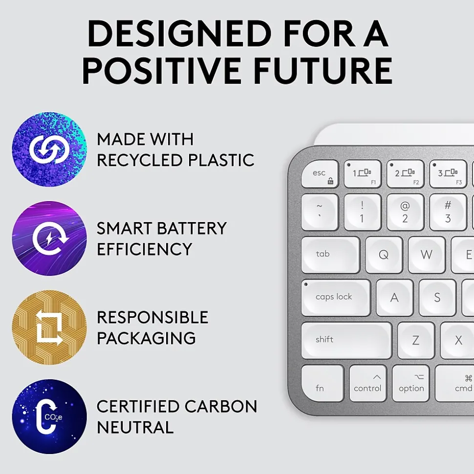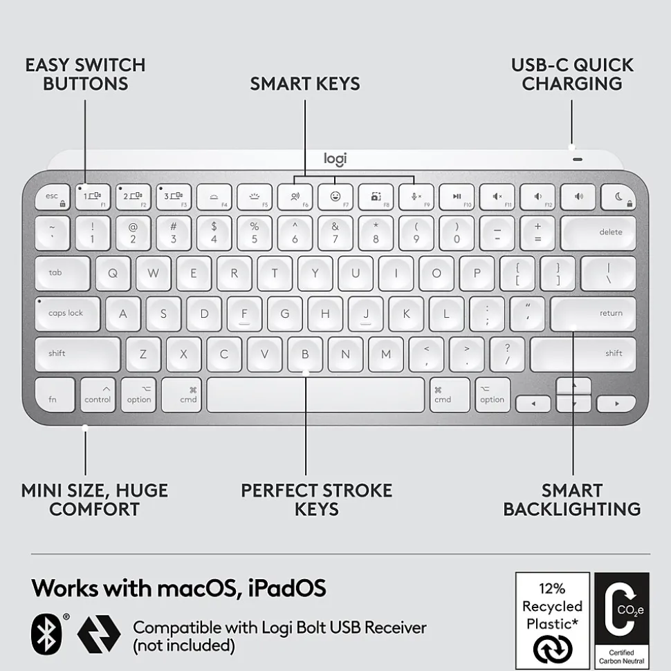 Introducing Logitech MX Keys Mini for Mac – a smaller, smarter, and mightier keyboard made for creators. Type with confidence on a keyboard crafted for efficiency, stability, and precision. The ergonomic design aligns your shoulders, allowing you to place your mouse closer to your keyboard for less arm reaching, more comfort, and improved body posture. Easily pair MX Keys Mini for Mac via Bluetooth Low Energy with up to three Apple devices. Smart Keys (requires Logitech Options software, available for macOS) transform the way you work, with a Dictation key to talk to text with the press of a button, an Emoji key to instantly open your emoji window, and a Mic Mute/Unmute button for smooth video calls. Team up with a Flow enabled MX Master 3 for Mac or MX Anywhere 3 for Mac and type on multiple devices in one fluid workflow. Transfer files, documents, and images across Apple devices.