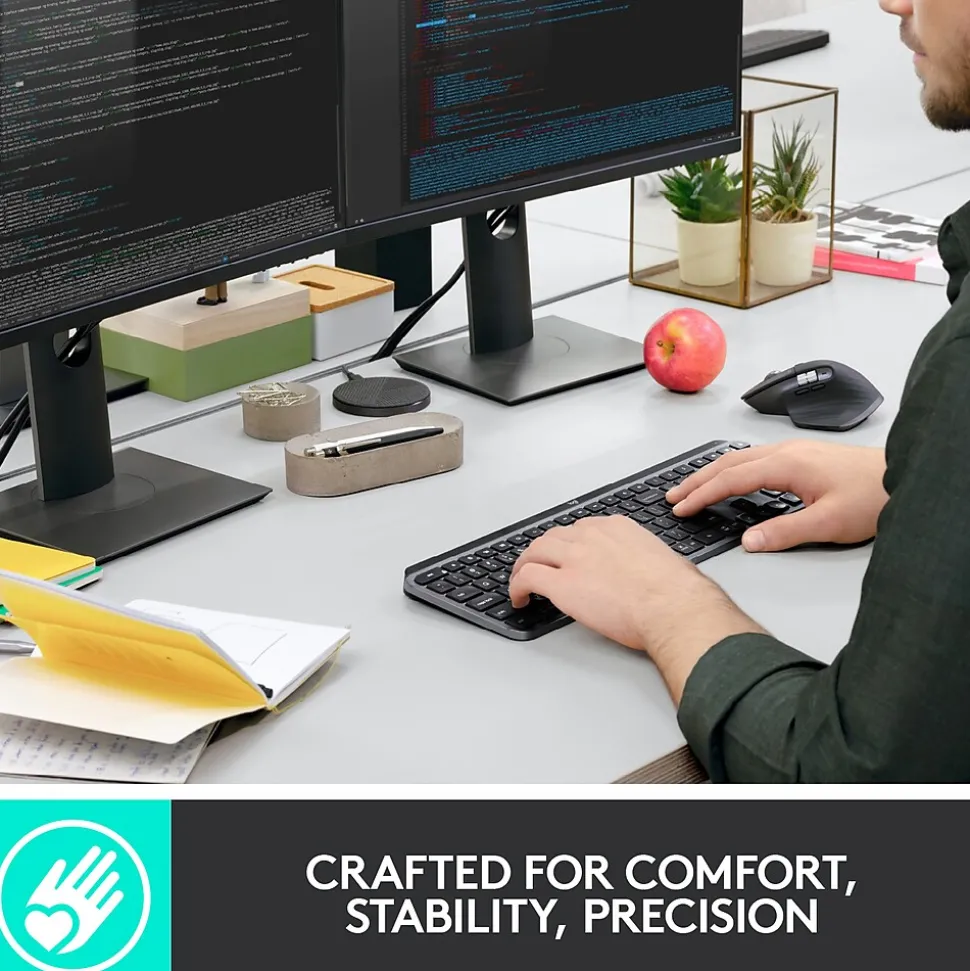Introducing MX Keys, an advanced wireless illuminated keyboard crafted for efficiency, stability, and precision. Perfect Stroke keys are shaped for your fingertips, and increased key stability reduces noise while optimizing responsiveness. Tactile reference for hand positioning makes it easy to stay oriented and in your flow. The backlit keys light up the moment your hands approach and automatically adjust to suit changing lighting conditions. MX Keys follows your MX Master 3 – or another Flow-enabled mouse – from one computer to another, meaning you can type on multiple devices in one fluid workflow. With MX Keys you can truly master what you make.