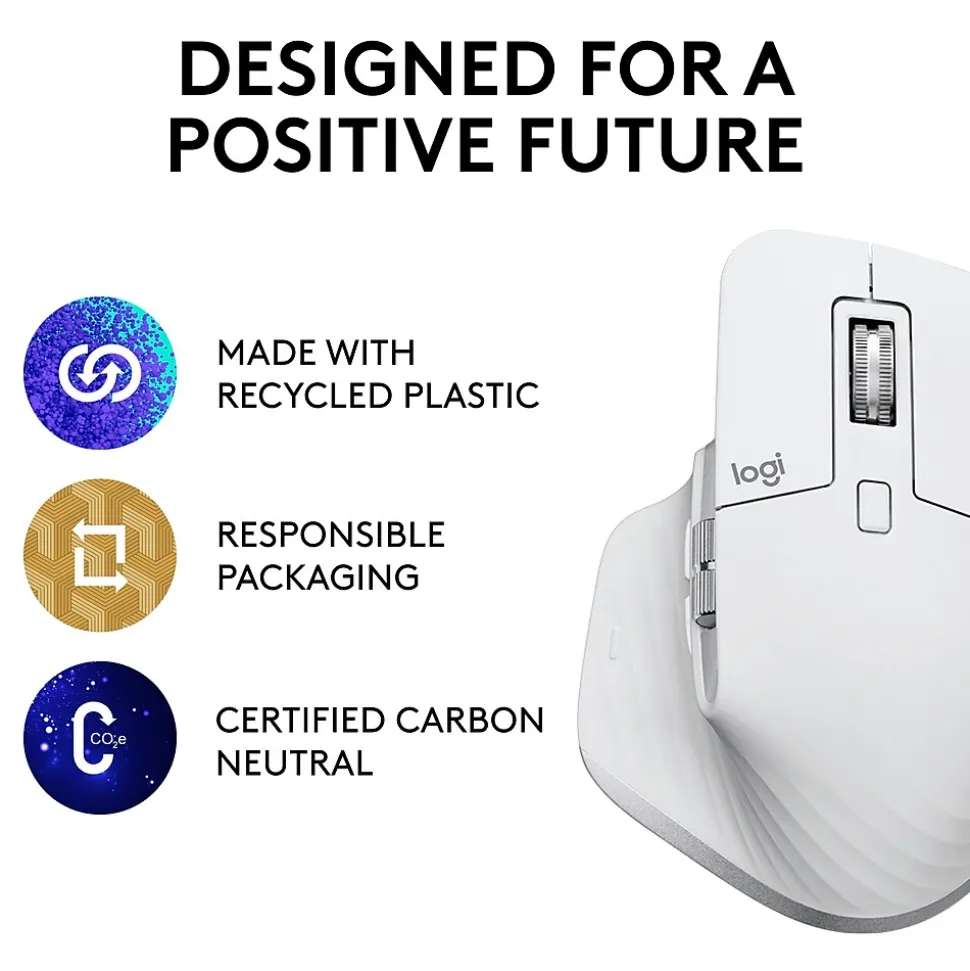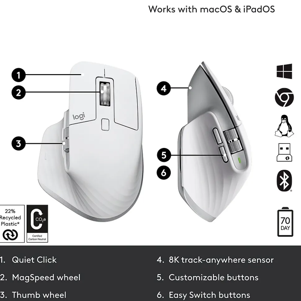Introducing the Logitech MX Master 3S, an iconic mouse remastered for ultimate tactility, performance, and flow. Silent buttons deliver a satisfying tactile feel with 90% less click noise. The MX Master 3S also comes with an 8000 dpi optical sensor for next-gen responsiveness on any surface, even glass. MagSpeed electromagnetic scrolling delivers remarkable speed, precision, and near silence with the ability to scroll 1000 lines a second. Ergonomic silhouette is crafted to support your palm and fingers and comes in pale gray. Logi Options+ enables Flow cross-computer control and introduces more customizations than ever. The MX Master 3S stays powered up to 70 days on a full charge and delivers 3 hours of use from a 1-minute quick charge. Connect the mouse with up to three devices via Bluetooth or the included Logi Bolt USB receiver on Windows, macOS, Chrome OS, or Linux.