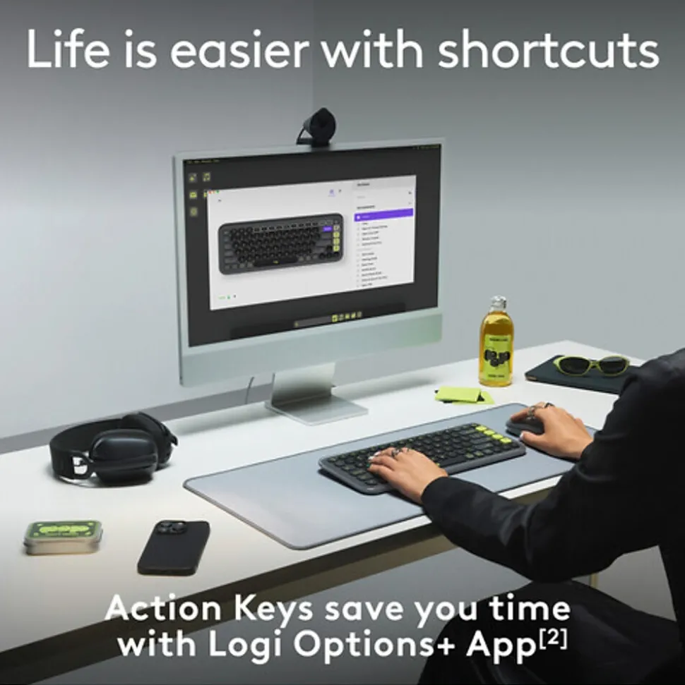 Skip the dull workspace and personalize your typing experience with the Logitech POP ICON Keys Wireless Keyboard. This keyboard boasts a bold graphite and green color combination, a transparent frame, contoured low-profile keys, and customizable Action Keys to deliver an expressive yet comfortable typing. Offering both Bluetooth and Logi Bolt wireless connectivity, it pairs with up to three devices and gives you convenient device switching with the touch of a button.
