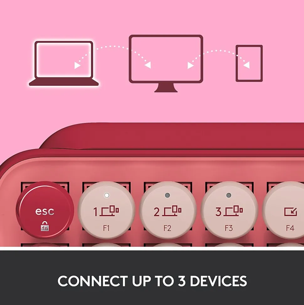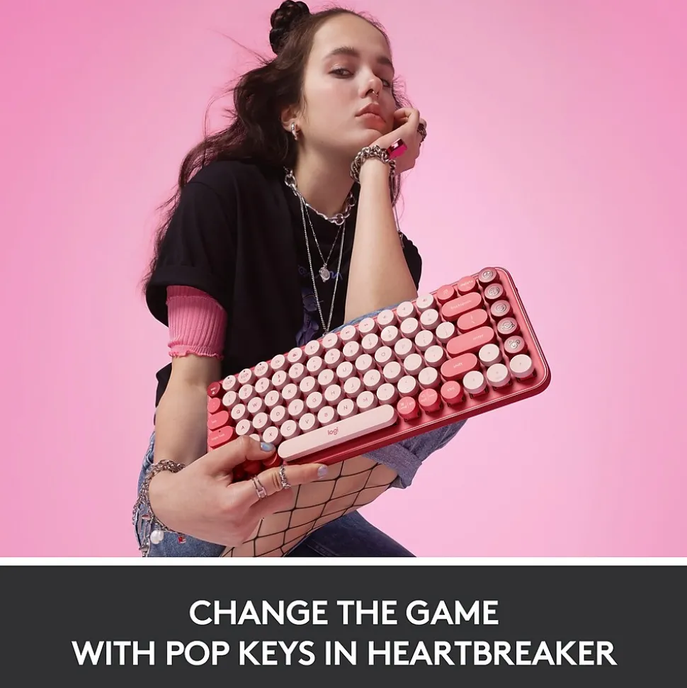 POP Keys Wireless Mechanical Keyboard from Logitech features a retro-typewriter design, complete with tactile, scoop-shaped mechanical keys and a caring heartbreaker rose color mixed with a neon coral and crushed raspberry aesthetic. This wireless Bluetooth keyboard is made to put some fun into your typing experience.