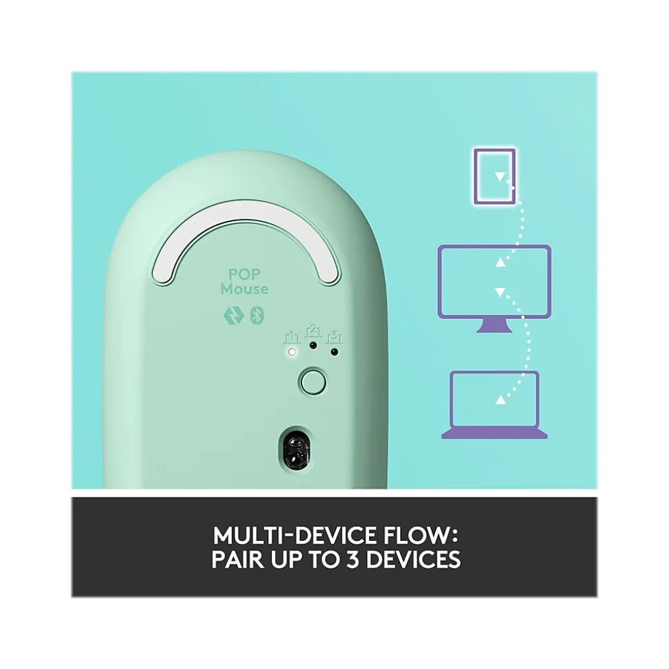 Get to know the playful wireless Logitech POP mouse designed to make personality shine on your desktop and beyond. Pick the Logitech POP mouse you love most from the range of designs, and make it your own with fun emoji customization. With SilentTouch clicks, and a battery life of up to 24 months, take it anywhere you go. Connect the mouse to your desktop, laptop, or tablet using Bluetooth on Windows, macOS, iPadOS, and Chrome OS. Glide between up to three devices at a time with Flow, and shift instantly from the high-precision to speed scroll mode with the SmartWheel.
