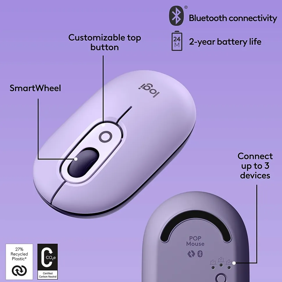 Get to know the playful, wireless POP Mouse, designed to make personality shine on your desktop and beyond. Pick the POP Mouse you love most from the range of designs, and make it your own with fun emoji customization. With SilentTouch clicks, and multiple months battery life, take it anywhere you go. Connect POP Mouse to your desktop, laptop, or tablet using Bluetooth on Windows, macOS, iPadOS and Chrome OS. Glide between up to 3 devices at a time with FLOW, and shift instantly from high-precision to speed scroll mode with the SmartWheel.