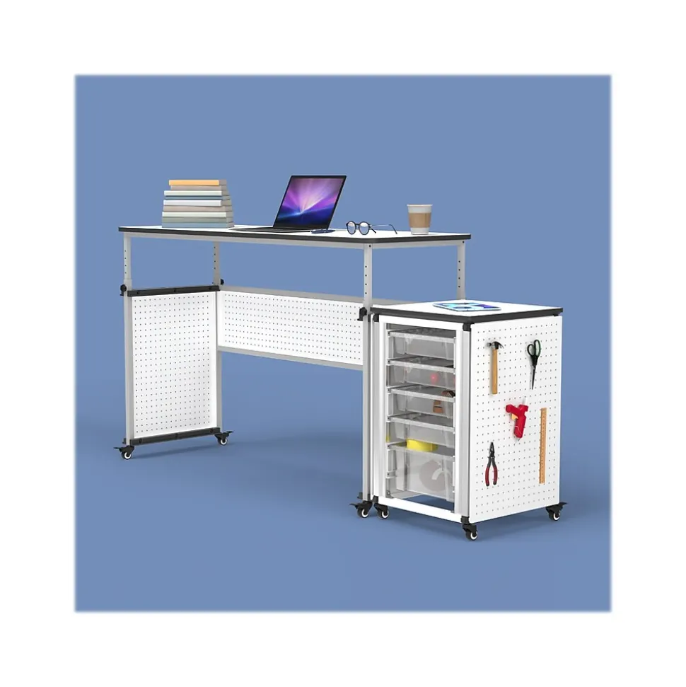 - Highlights include a chemical-resistant top, tool-free adjustable height, a modesty panel, and multiple built-in pegboards